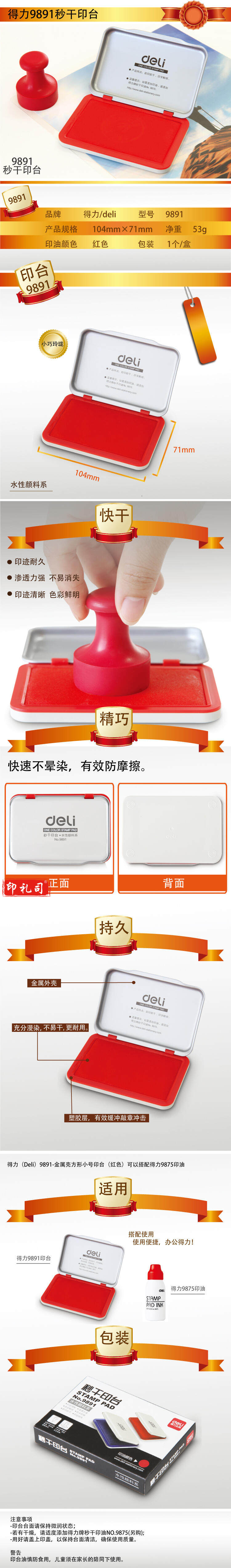 得力(deli) 秒干印油 金属方形秒干印台 财务用品 印台 小号印台 9891红色