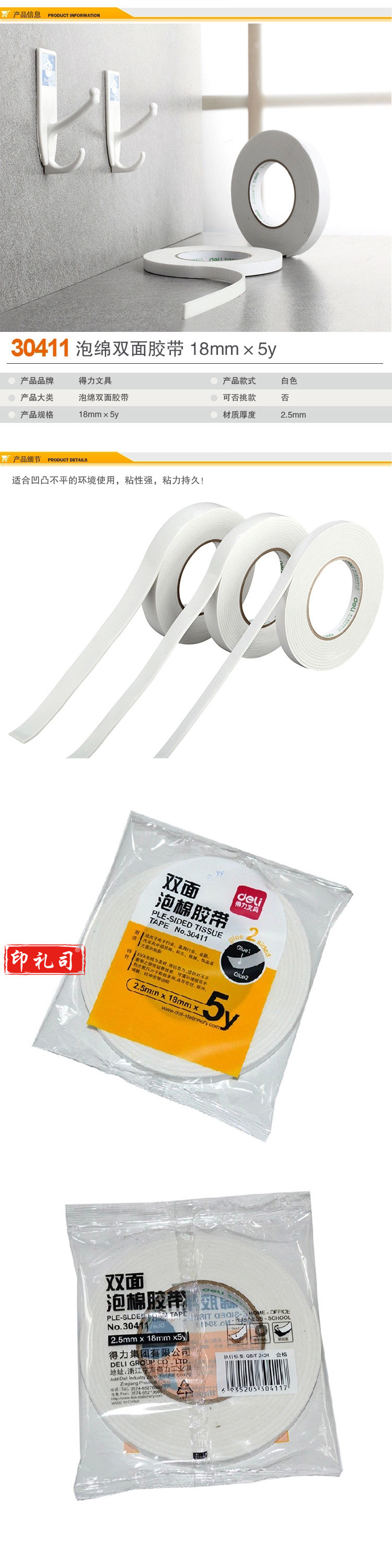 得力 30411 双面泡棉胶 2.5mm*18mm*5Y
