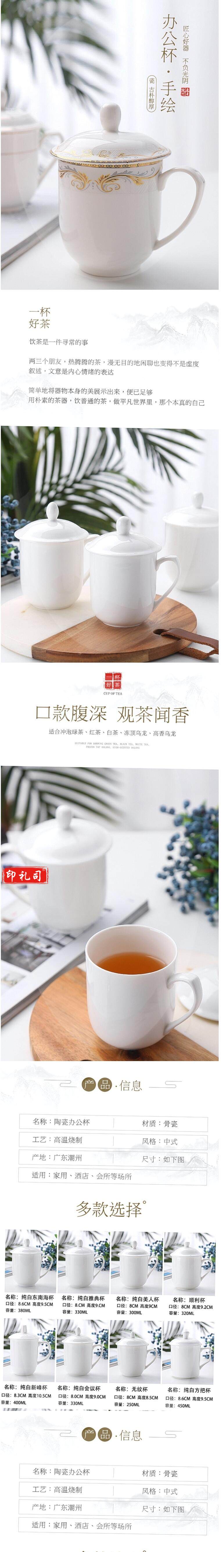 陶瓷茶杯 白色会议杯 金边带盖办公室喝水杯子