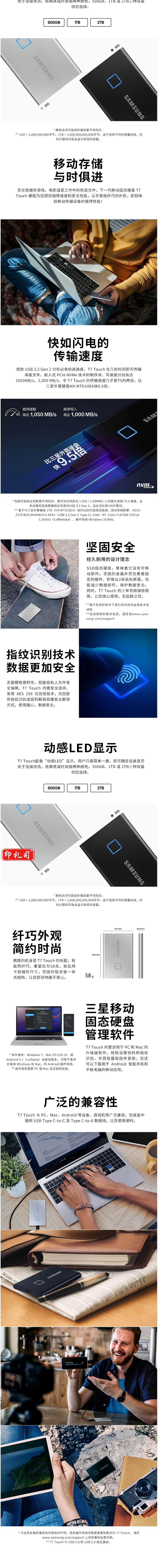 三星 1TB Type-c USB 3.2 移动固态硬盘(PSSD) T7 Touch 黑色 NVMe传输 1050MB/s 指纹识别
