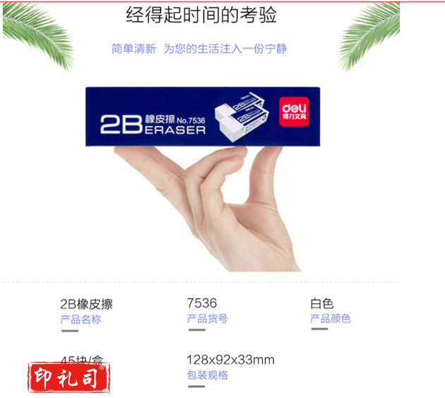 得力(deli)7536 2B 学生考试美术多彩橡皮擦 45块/盒 30*27*12mm/块