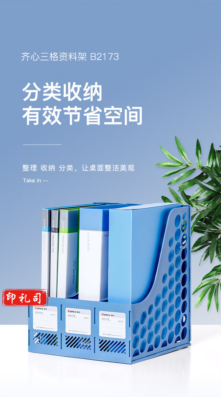 齐心(Comix) 三联桌面文件框 三栏带标签稳固文件栏/文件筐/资料框 蓝色B2173