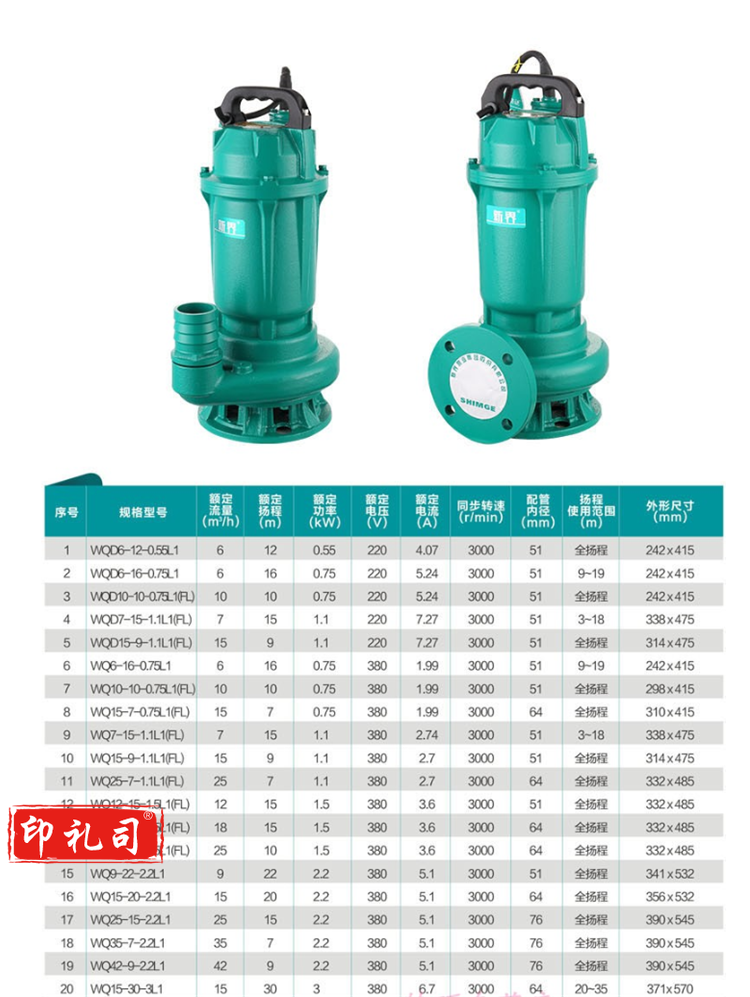 上海人民 WQD10-10-0.75KW 2寸 220V 无堵塞污水泵