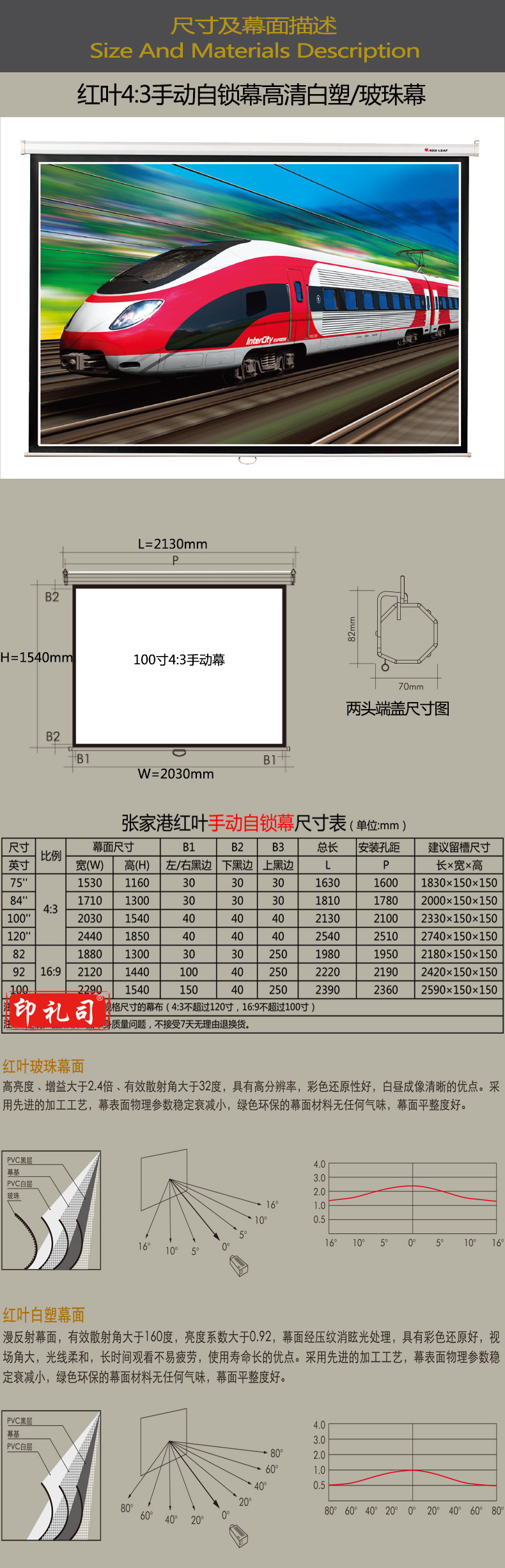 红叶(HONGYE)手动自锁幕120寸4:3高清手动幕玻珠幕白塑幕商用家用 2.44*1.85