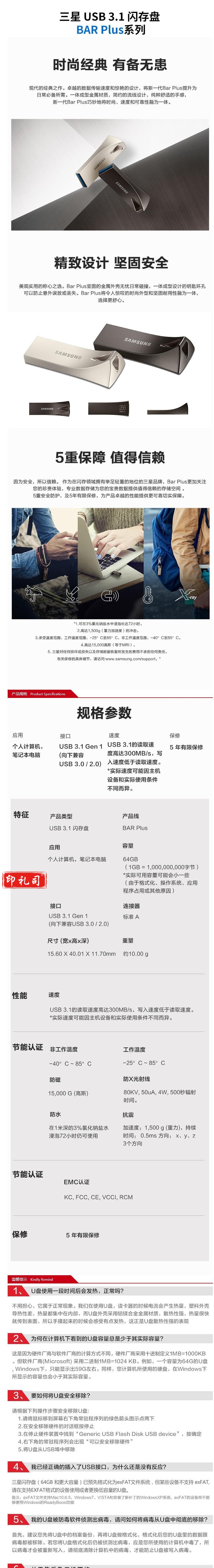 三星(SAMSUNG)64GB USB3.1 U盘 BAR升级版+ 深空灰 读速300MB/s 高速便携(Gen 1)BE4