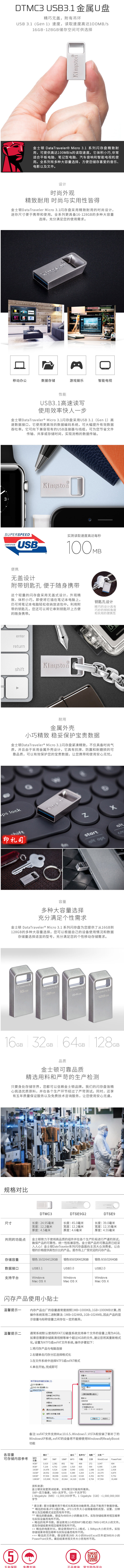 金士顿 128GB USB3.1 U盘 DTMC3 银色金属 读速100MB/s