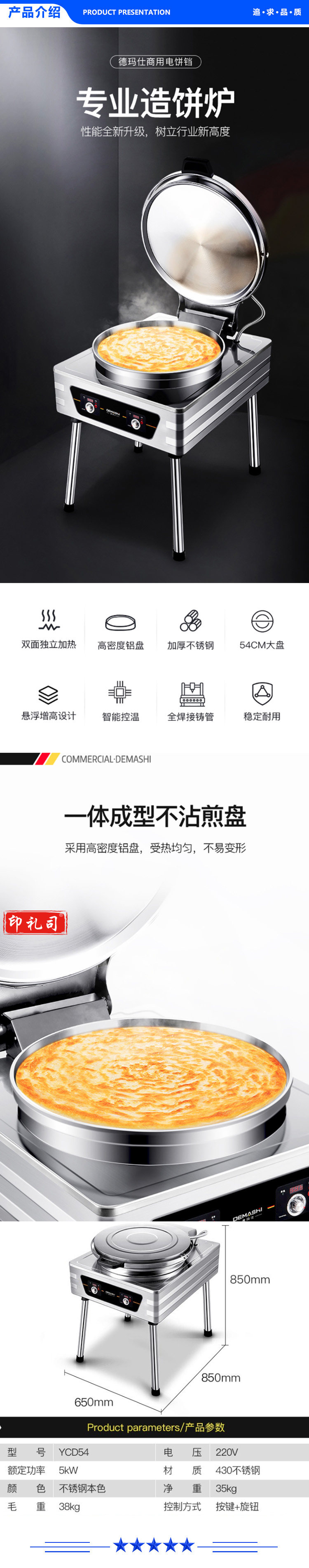 德玛仕 DEMASHI YCD54 电饼铛 商用 大型双面加热 自动电热大号烤饼炉 烙饼机 220V电压