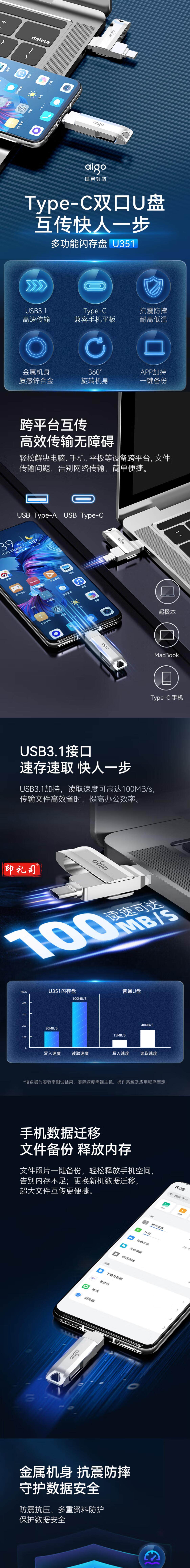爱国者 32GB Type-C USB3.1 双接口U盘 U351银色手机电脑用