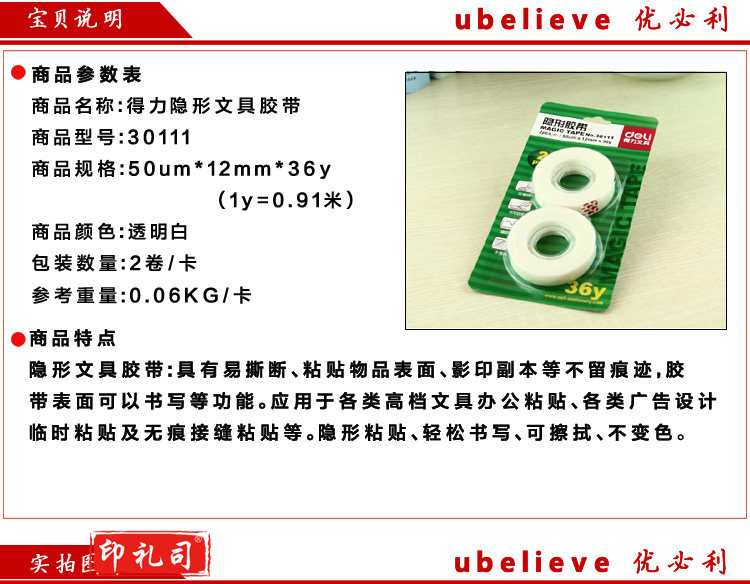 得力(deli) 得力文具 得力隐形胶带 30111 无痕 可书写 隐形粘贴 胶条 1卡