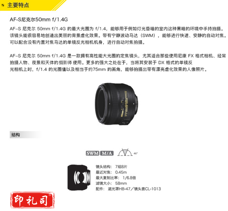 尼康(Nikon) AF-S 50mm f/1.4G 全画幅标准定焦镜头