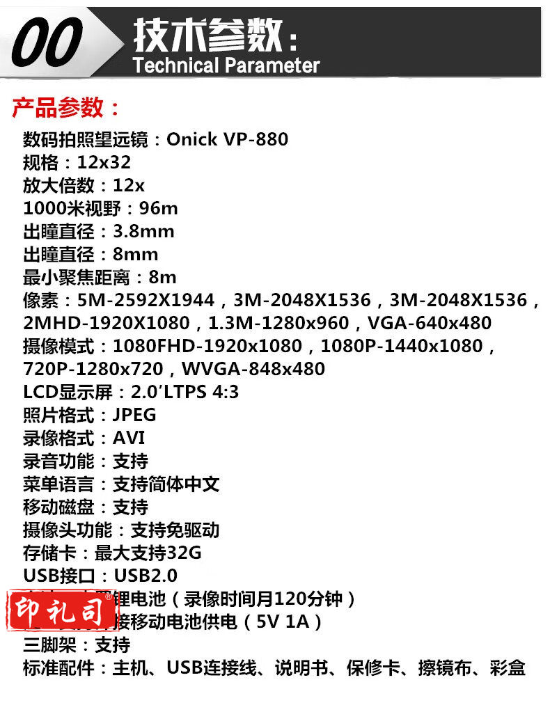 欧尼卡VP-880 多功能双筒超高清夜视数码12倍带屏可拍照录像望远镜