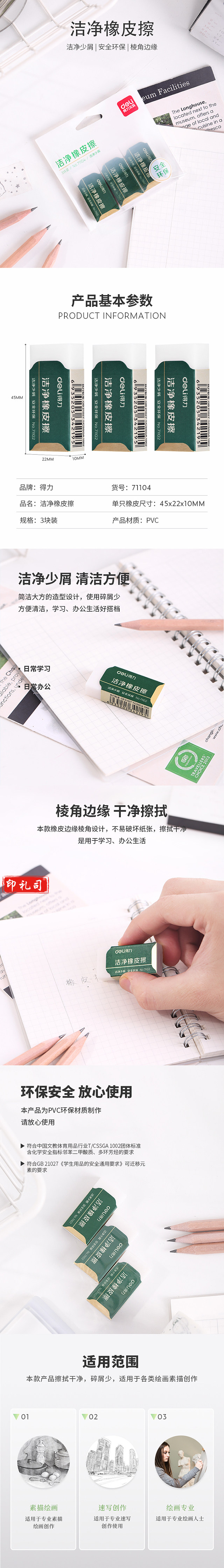 得力71104袋装小号洁净橡皮擦(白)