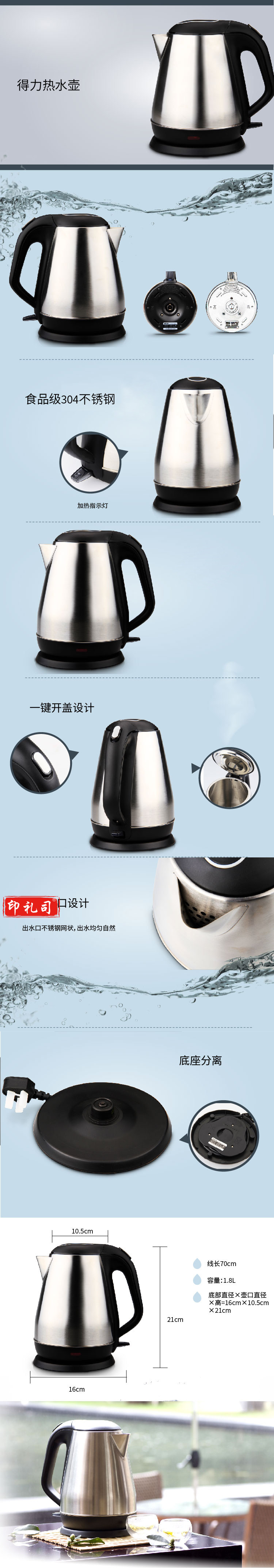 得力(deli)0764电热水壶1.8L(灰白)(台)单层不锈钢