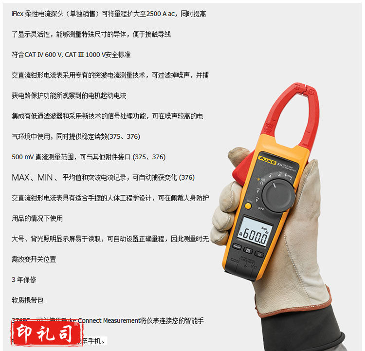 福禄克(FLUKE)375FC/CN 真有效值钳形电压电流表 无线通讯交/直流钳形万用表