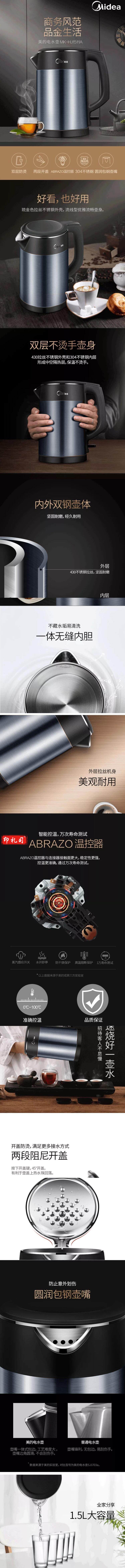 美的MK-HJ1511 电热水壶 1.5L双钢防烫无缝内胆 304不锈钢进口温控 防干烧1.5L