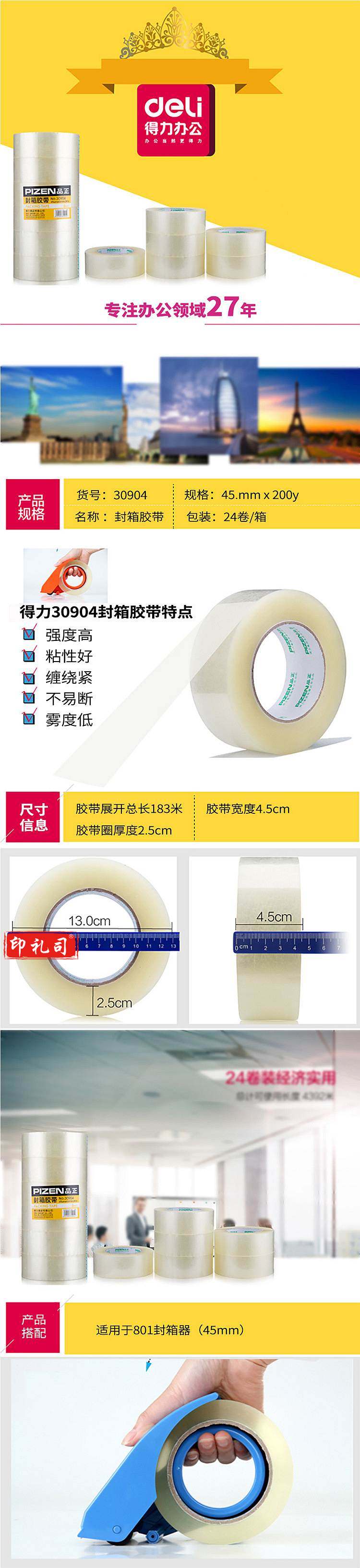 得力品正 30904 封箱胶带 45mm*200y*45um (单位:筒) 透明(6卷/筒)