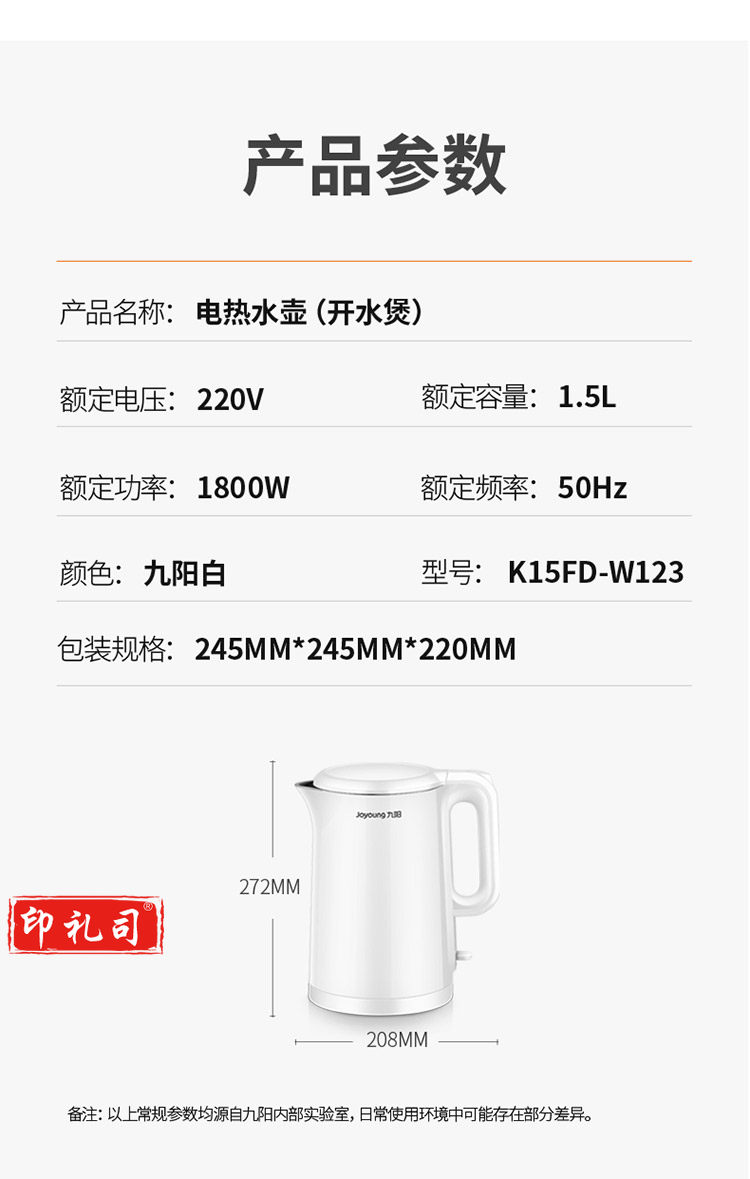九阳K15FD-W123 电热水壶 双层壶体 隔热防烫 1.5L